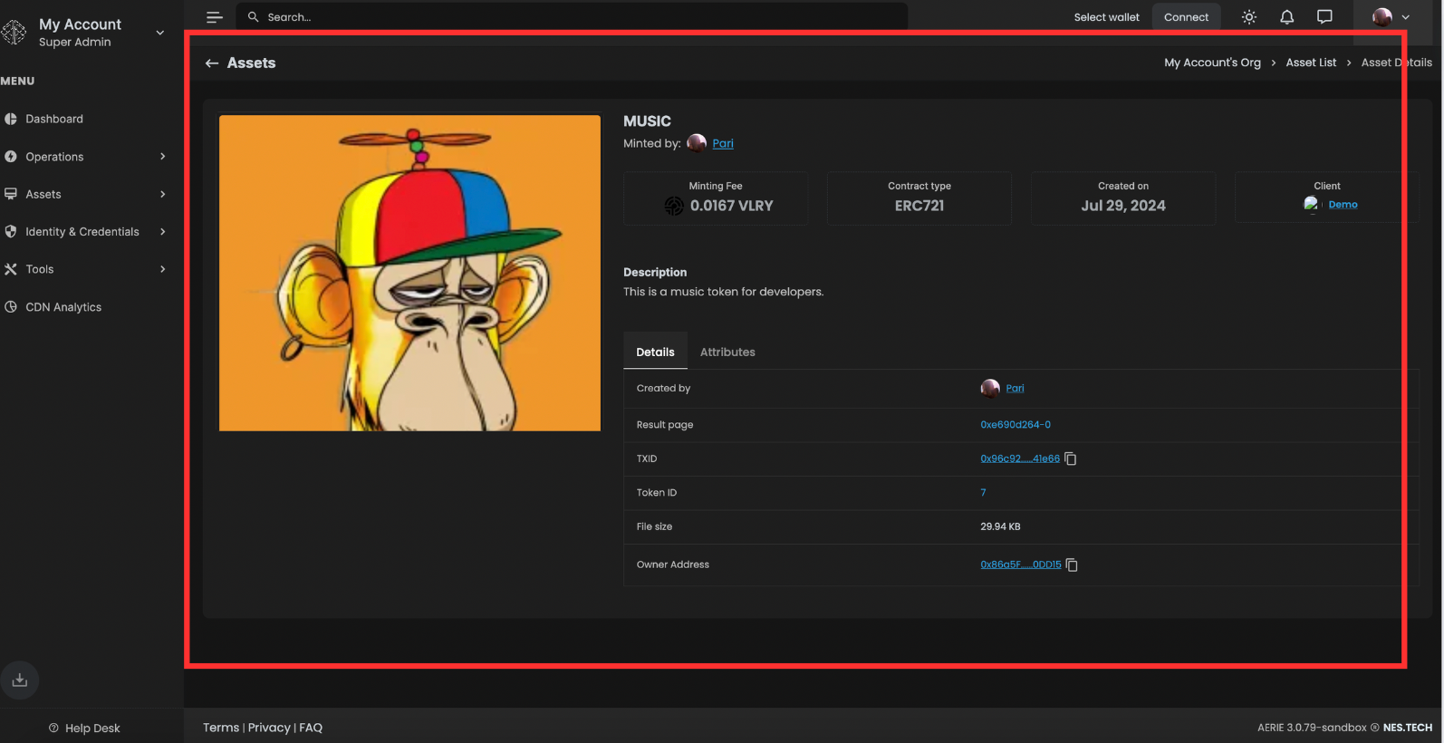 Attributes Management: Allows users to view and manage various attributes associated with the asset, enhancing the customization and utility of each NFT.