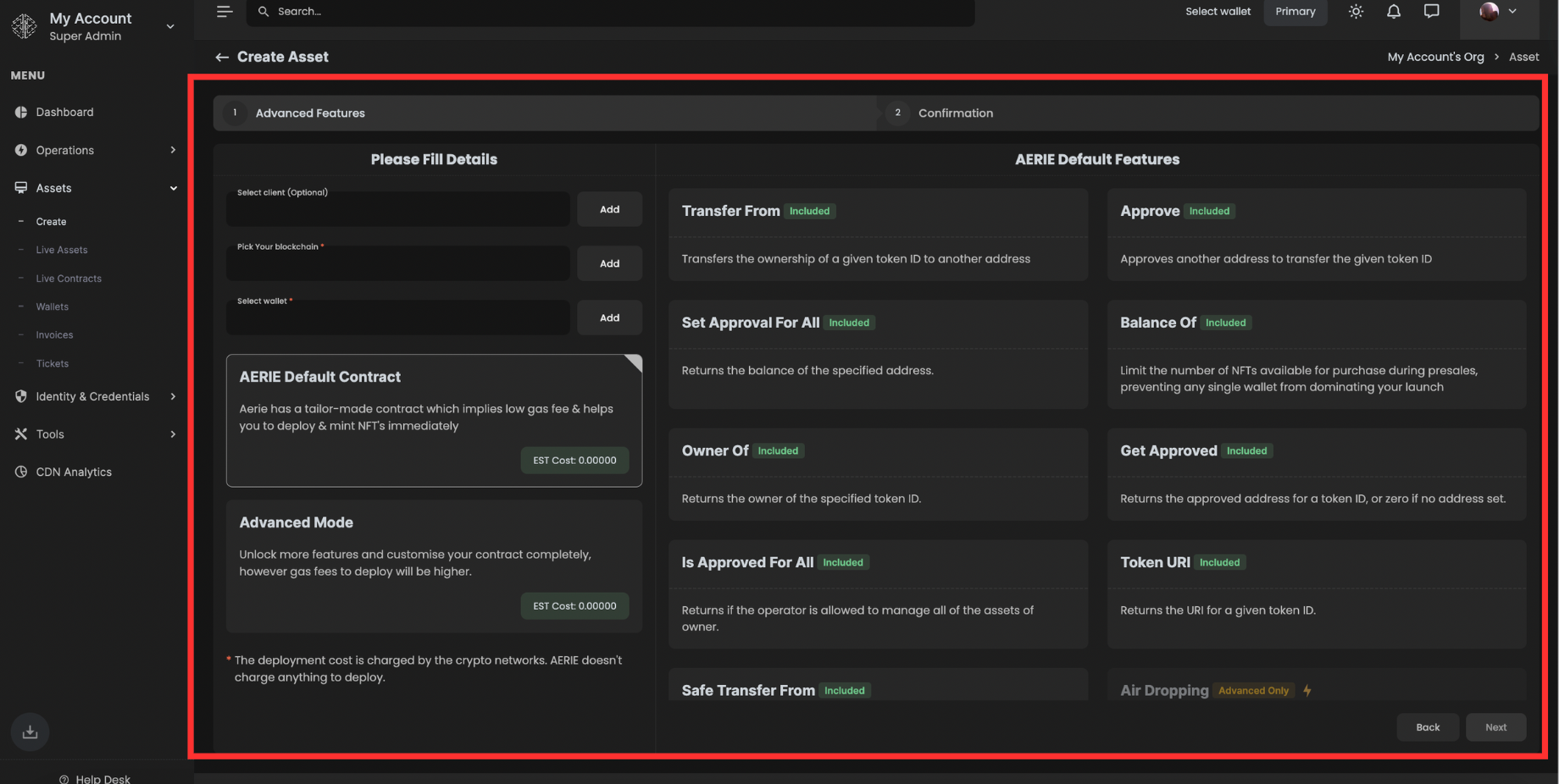 Deployment Cost: Note the estimated gas fee for deployment, which varies depending on the selected blockchain network. Aerie does not alter these fees, which are directly charged by the network.
