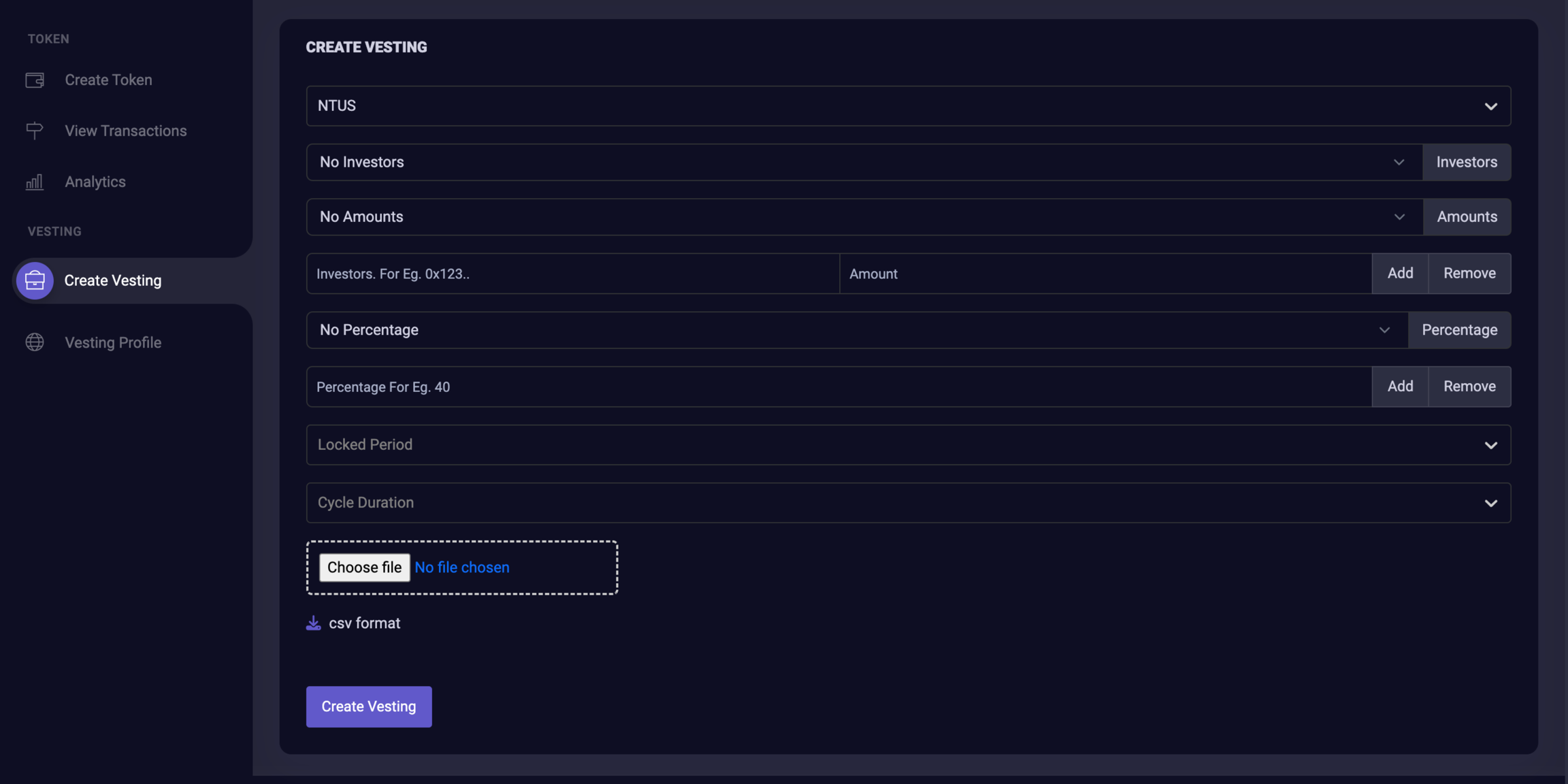View Active Vesting Schedules: The Vesting section provides an overview of all active vesting schedules, including key details like the amount vested, the release schedule, and remaining tokens.