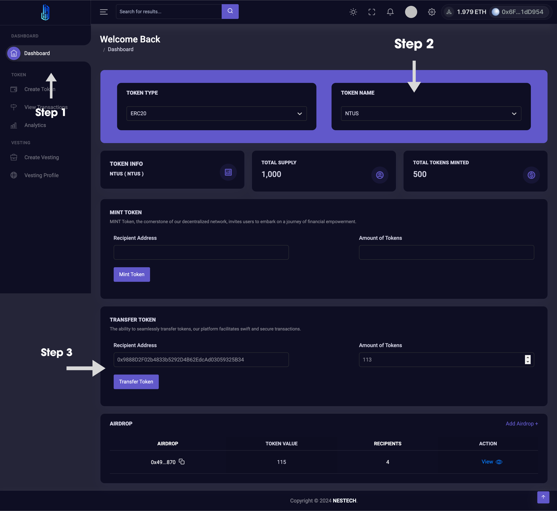 You will be prompted to enter the recipient's Ethereum address and the amount of tokens you intend to transfer.